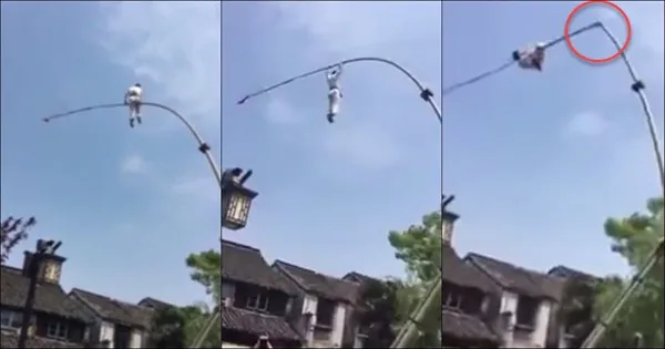 เหตุการณ์ดังกล่าวเกิดขึ้นในงานแสดงโชว์กลางแจ้งแห่งหนึ่งในประเทศจีน นักท่องเที่ยวที่ไปชมการแสดงสามารถถ่ายคลิปบันทึกเหตุการณ์เอาไว้ได้ จากในคลิปจะเห็นได้ว่า นักแสดงชายเกาะอยู่บนเสาไม่ไผ้ สูงจากพื้นประมาณ 8 เมตร ซึ่งจริง ๆ แล้วความสูงของเสามีมากกว่านั้น แต่น้ำหนักของนักแสดงทำให้เสาโน้มลงมาประมาณ 45 องศา