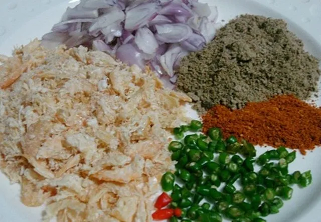 1.โขลกกุ้งแห้งจนเนื้อฟูหรือถ้าใครจะปั่นก็ได้เเต่เนื้อจะไม่ค่อยฟู