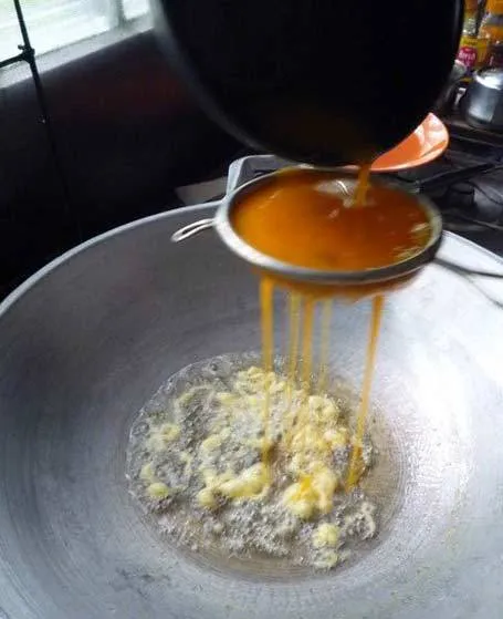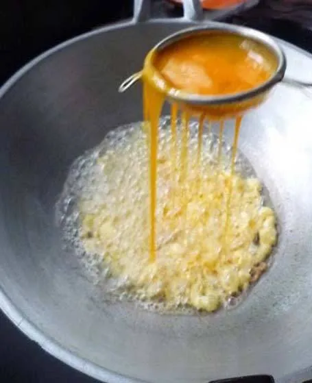 การโรยไข่ ผ่านกระชอนตาถี่ปานกลางต้องทำให้สูงๆ เน้นให้มันตกกระทบน้ำมันแล้วเป็นฝอย โรยแล้ววนนะคะ อย่างโรยอยู่กับที่ ไม่งั้นกระชอนไม่ได้ช่วยไรค่า