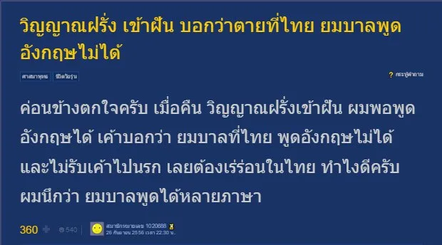 หนุ่มโพสถามในเว็บดัง ขอชาวเน็ตช่วยเหลือ วิญญาณฝรั่งเข้าฝันบอกว่าตายอยู่ที่ไทย ยมบาลพูดอังกฤษไม่ได้!!!?