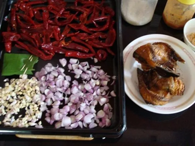 - เอาส่วนผสมจากข้อ 1, 2 และ 3 รวมทั้งกุ้งแห้งป่นมา โขลกจนละเอียด (สำหรับครัวสมัยใหม่ ก็สามารถใช้เครื่องบดแทนได้ในขั้นตอนนี้)