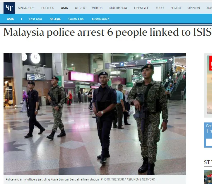 สำนักข่าวแชนแนลนิวส์เอเชีย รายงานว่า ทางการมาเลเซียได้จับกุมผู้ต้องสงสัยว่าจะมีส่วนเกี่ยวข้องกับกลุ่มก่อการร้าย IS ได้ 6 คนโดยผู้ต้องสงสัยทั้งหมดเป็นชาวมาเลเซีย โดยจับกุมได้เมื่อ วันที่ 24 มีนาคม ถึง 25 เมษายนที่ผ่านมา เป็นชาย 4 คน และหญิง 2 คน โดยชาย 2 คนแรกถูกจับที่รัฐกลันตัน ในข้อหาลักลอบค้าอาวุธจากชายแดนไทยเข้าไปยังมาเลเซีย และหนึ่งในผู้ถูกจับกุม เป็นผู้พยายามวางแผนก่อวินาศกรรมในมัสยิดของชาวมุสลิมนิกายชีอะห์ในปีนังอีกด้วย