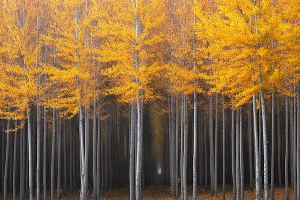 Light breaks through a grove of trees in Northern Oregon