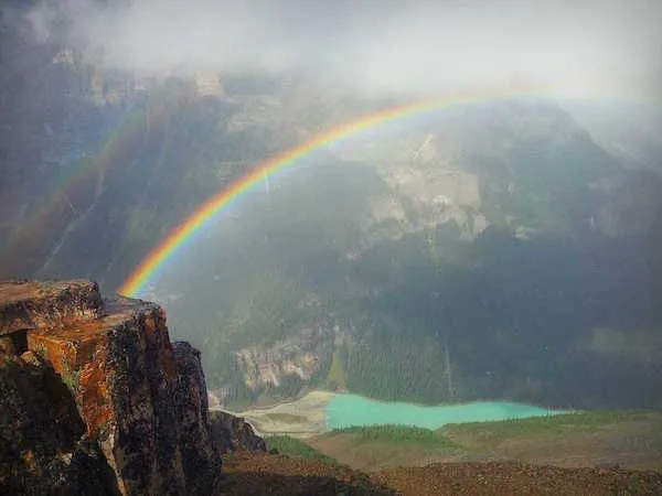 Rainbow over Lake Louise from the top of Mt. Fairview – Alberta, Canada