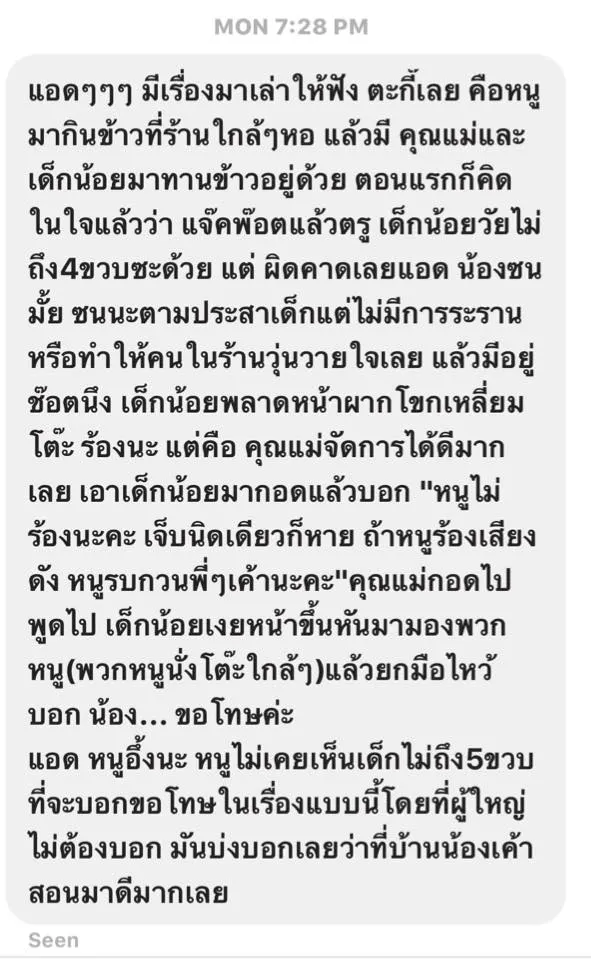 สาวมากินข้าวกับเพื่อน เจอเด็กวิ่งเล่นในร้านไปมาจนหัวเขกโต๊ะ จากนั้นได้ฟังคำพูดที่แม่เด็กสอน ทำเอาชาวเน็ตปลื้มไปตามๆกัน