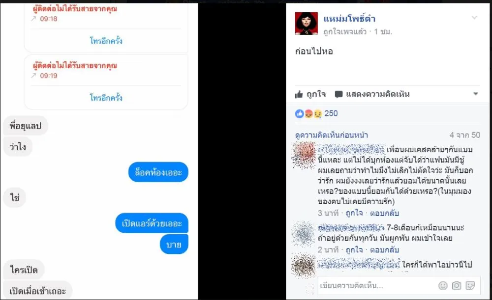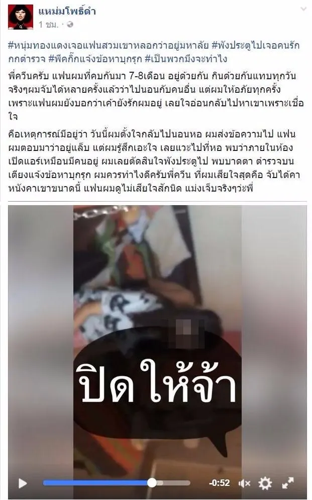 เพจแหม่มโพดำ โพสคลิปและข้อความว่า หนุ่มคนหนึ่ง จับได้ว่าแฟนมีกิ๊ก จึงบุกพังประตูห้องพัก เจอภาพบาดตาเข้าเต็มๆ แฟนสาวนอนกกอยู่กับกิ๊กสีกากี.... แถมโดนกิ๊กแจ้งข้อหาบุก