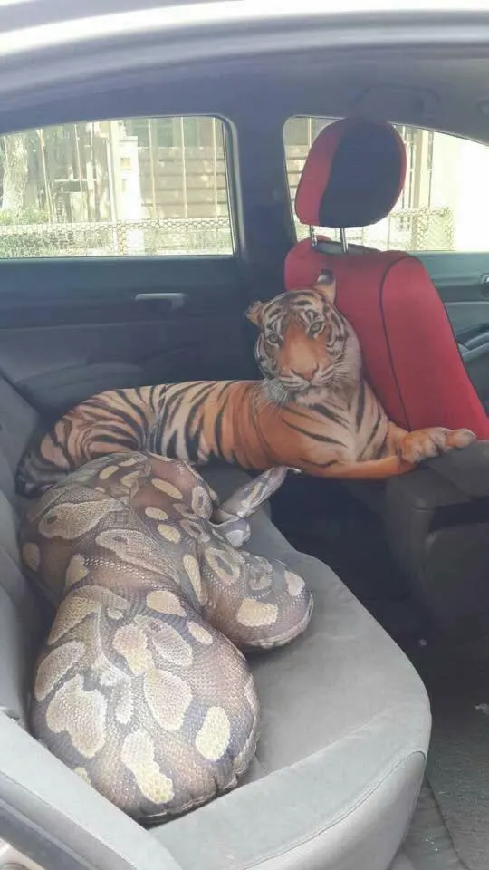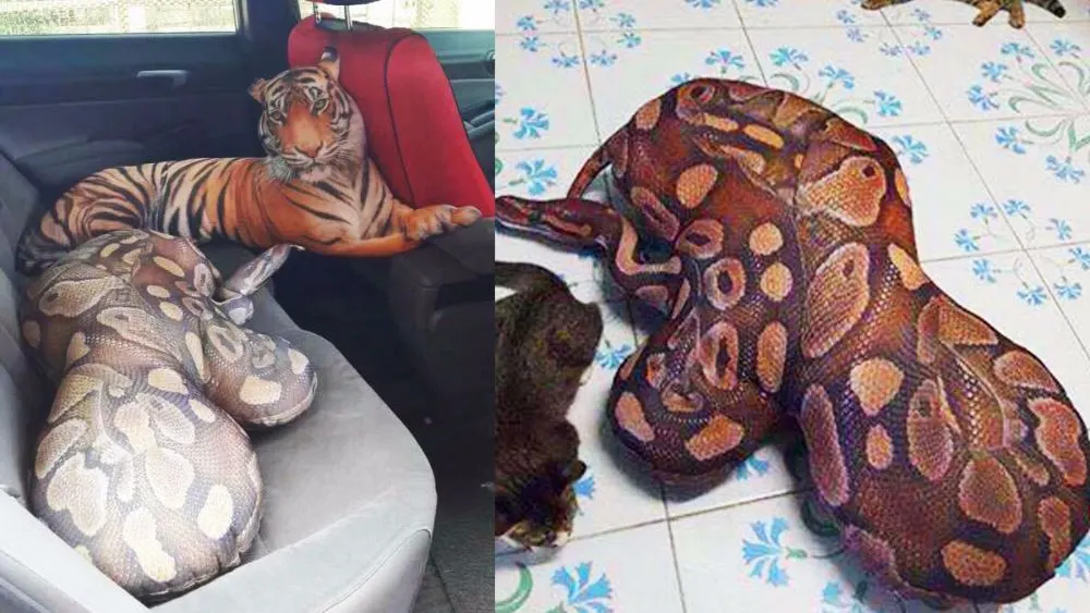 ชาวเน็ตแชร์ภาพ หมอนเสือ และหมอนงู ซึ่งดูเหมือนจริงมา เอามาวางไว้บนรถหลอกขโมยก็เข้าท่านี้นะ!