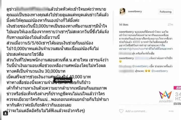 เมือวันที่ 7/5/2560 ทาง แฟนสาวของ ดีเจเชาเชา ได้โพสต์ IG กรณีเงินช่วยเหลือครอบครัวนายจิรภาษ ธงอาษา หรือน้องเบลล์ อายุ 18 ปี ผู้เสียชีวิต ว่าได้ให้เงินช่วยเหลือครอบครวนี้ไปแล้ว สี่หมื่นกว่าบาท วอนสังคมเห็นใจด้วย เค้าก็ทำงานหาเงินมาลำบากเหมือน