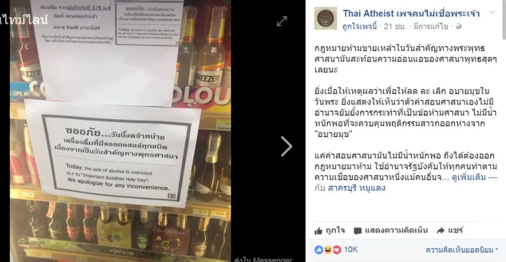 กฎหมายห้ามขายเหล้าในวันสำคัญทางพระพุทธศาสนามันสะท้อนความอ่อนแอของศาสนาพุทธสุดๆ เลยนะ