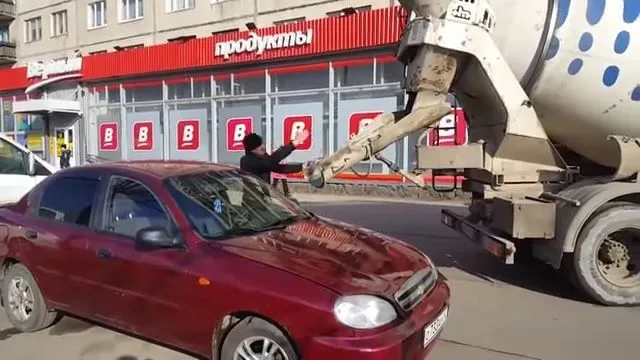 ภาพชายคนหนึ่งกำลังสั่งให้รถขนปูนซีเมนต์เทใส่รถของภรรยาตนเองเข้าทางหน้าต่างของรถ
