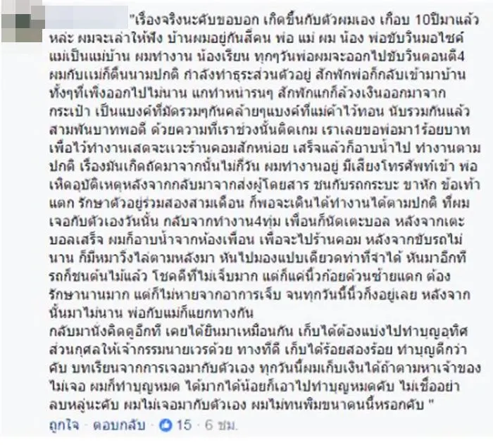 วันต่อมาก็มีข่าวอุบัติเหตุรถยนต์บริเวณที่เราเห็นเงินเมื่อวาน และที่สำคัญในมือของศพกำแบงค์ร้อยใบนั้นไว้แน่นหลังจากเกิดเรื่องนี้ เพื่อนจอมโลภของฉันก็ไม่กล้าเก็บอะไรจากข้างถนนอีกเลย ของทุกอย่างมักมีเจ้าของ ระวังเจ้าของจะมาทวงคืนหลังจากนั้นก็มีผู้ที่ได้ประสบการณ์ตรงออกมาแสดงความ คิดเห็นอย่างมาก ดังนี้