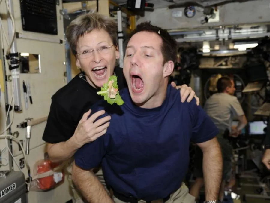 9. ผู้บังคับบัญชา Peggy Whitson เดินทางสู่สถานีอวกาศนานาชาติ และทำหน้าที่เป็นหัวหน้าลูกน้องในทีมอีก 2 คน กลายเป็นผู้บังคับบัญชาหญิงที่ใช้ชีวิตอยู่บนอวกาศนานที่สุด กินเวลาถึง 364 วัน ในภาพนี้เธอกำลังหยอกล้อกับลูกทีมขณะรับประทานอาหาร