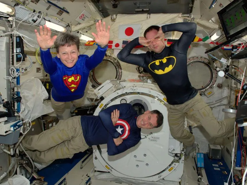 3. เหล่านักบินอวกาศสวมเสื้อสกรีนสัญลักษณ์ของฮีโร่สุดโปรดและลอยตัวในสภาวะไร้น้ำหนัก ซึ่งภาพนี้ทำให้เด็กๆ บนโลกส่งคำถามไปถามนาซาว่า ทำไมพวกเธอไม่มีพลังพิเศษแบบนี้บ้าง