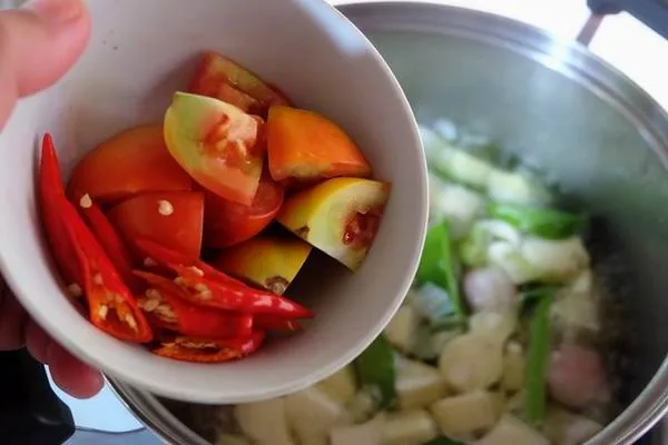 รอจนเดือดแล้วก็ใส่พริกขี้หนูทุบกับมะเขือเทศหั่นเป็นชิ้นพอดีคำลงไป แต่หั่นไม่ต้องเล็กมากนะคะเดี๋ยวมันจะเละ