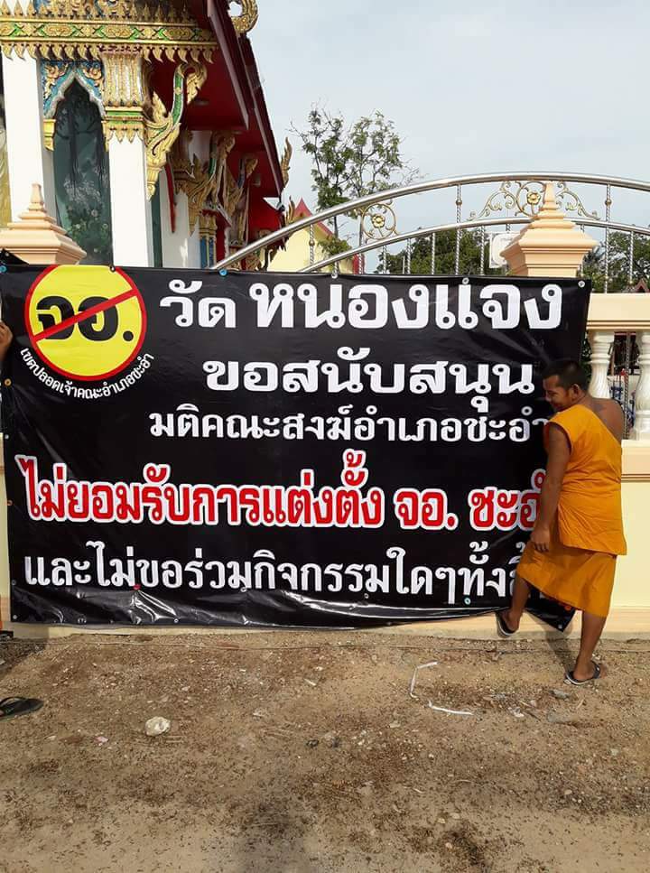 ขณะนี้ใน facebook กลุ่มต่างๆ ของ จ.เพชรบุรี อาทิ 'สะกิดข่าว : คณะสงฆ์เมืองเพชร' 'กลุ่มจังหวัดเพชรบุรี' มีการโพสต์ภาพป้ายข้อความขนาดใหญ่ ประมาณ 2 x 3 เมตร ด้านล่างสัญลักษณ์เป็นตัวหนังสือสีขาวเขียนว่า 'เขตปลอดเจ้าคณะอำเภอชะอำ'