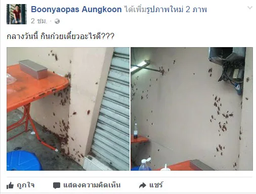 โลกออนไลน์ได้มีการแชร์ภาพสุดสะพรึง! ภาพจากBoonyaopas Aungkoonได้โพสท์ รูป ร้านอาหารข้างทางแห่งหนึ่ง โดยภาพถ่ายเต็มไปด้วยแมลงสาบ ยั๊วะเยี้ยะเต็มพื้น ลามไปถึงผนัง...พร้อมกับข้อความระบุว่า กลางวันนี้ กินก๋วยเตี๋ยวอะไรดี???