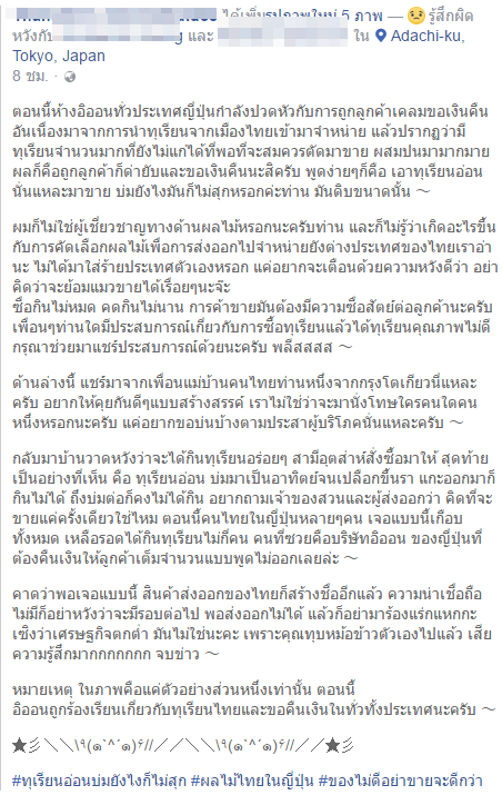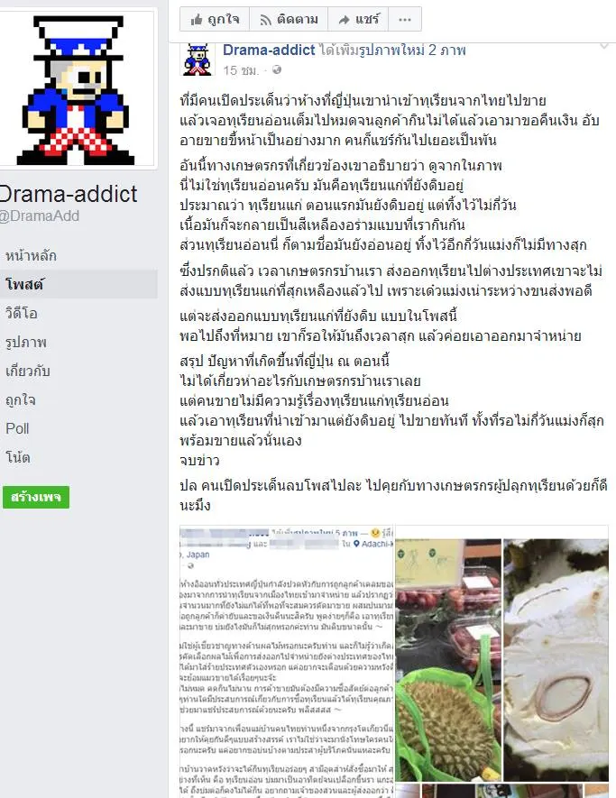 จากกรณี มีผู้ใช้เฟสบุ้คท่านนึง ได้โพสต์ ภาพ ทุเรียน ที่ส่งออกจากประเทศไทย ไปขายที่ ญี่ปุ่น แต่พบว่าทุเรียนยังไม่แก่พอที่จะนำขาย พร้อมกับเขียนข้อึควมาประมาณว่า ทุเรียนอ่อนไปก็ไม่ควรนำมาขาย เพราะจะทำให้เวียชื่อเสียง