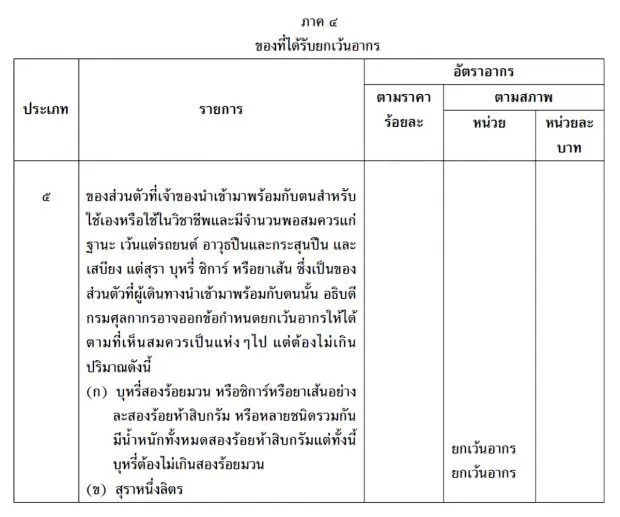 3. บุหรี่ไม่เกิน 200 มวน หรือซิการ์ ยาเส้นไม่เกิน 250 กรัม หรือหลายชนิดรวมกันไม่เกิน 250 กรัม แต่ทั้งนี้บุหรี่ต้องไม่เกิน 200 มวน