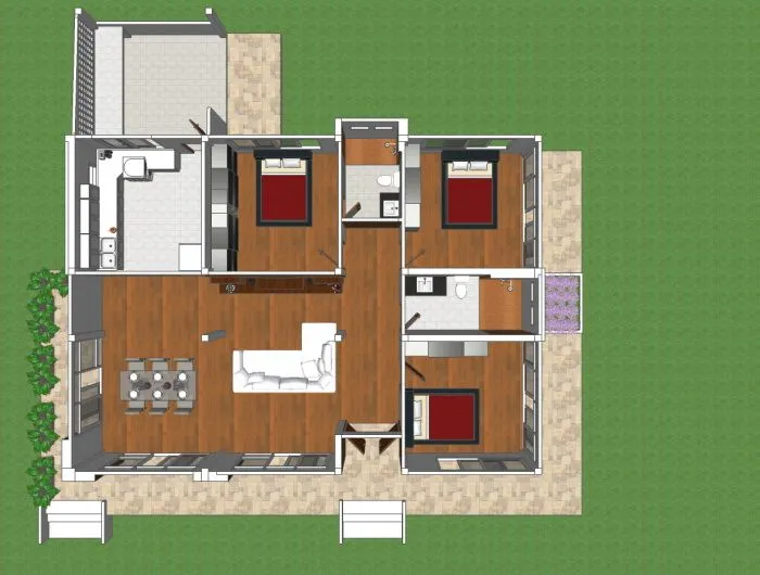 บ้านหลังนี้มีทั้งหมด 3 ห้องนอน 1 ห้องน้ำ พื้นที่ใช้สอย 190 ตารางเมตร คิดเป็นงบก่อสร้างจะอยู่ที่ 1.8 – 2.0 ล้านบาทครับ (ไม่รวมตกแต่งเฟอร์นิเจอร์) หากคุณเป็นคนที่ชอบบ้านรูปทรงทันสมัย ที่ไม่ทิ้งกลิ่นอายความเป็นธรรมชาติ ขอแนะนำหลังนี้เลยจ้า
