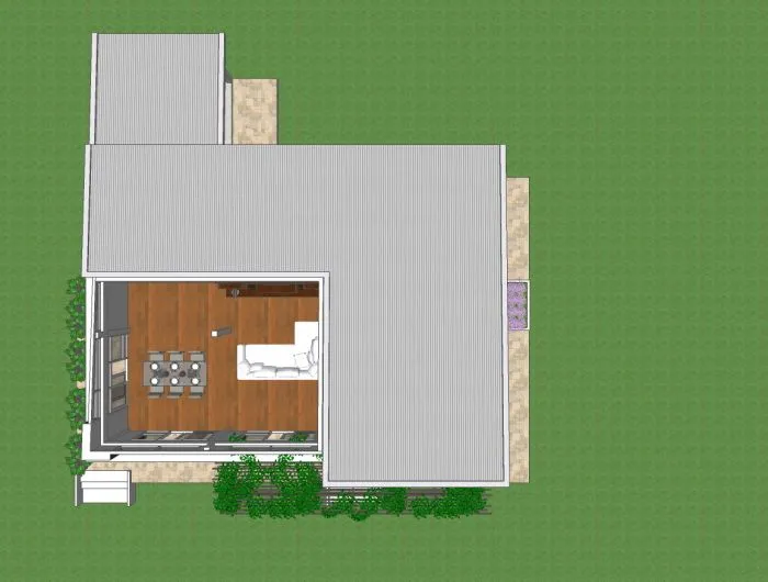 ลักษณะบ้านออกแบบเป็นทรงหน้ากว้างหลังแคบ เมื่อเดินเข้ามาภายในจะพบกับห้องโถงทรงตัว L มีโต๊ะรับประทานอาหาร และโซฟาสำหรับดูทีวี จัดห้องครัวไว้ทางซ้ายมือด้านในสุด มีทางเชื่อมออกไปสู่ระเบียงด้านหลัง ส่วนห้องนอนจัดไว้ตรงกลางด้านหลัง และทางขวามือของตัวบ้าน
