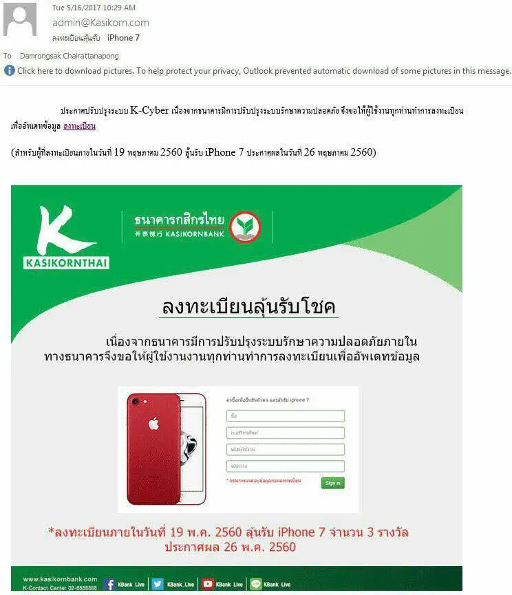 KBank แจ้งเตือน กรณีอีเมลลุ้นโชครับ iPhone 7 Red ที่ให้กรอกรหัสผ่านผู้ใช้
