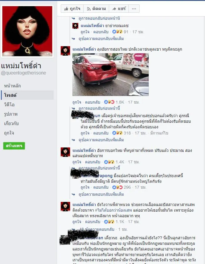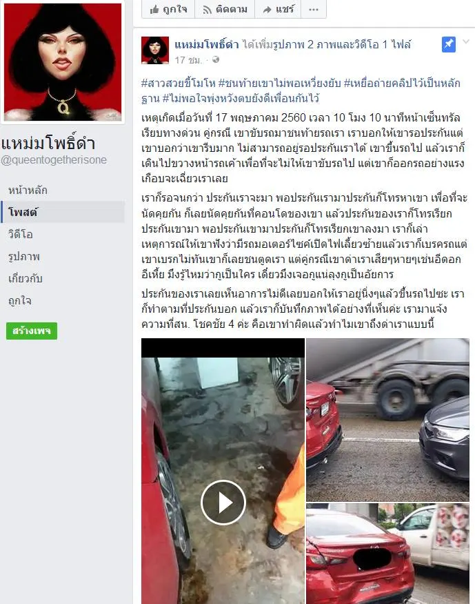 เมื่อ วันที่ 1/5 2560 ทาง เพจดัง เฟซบุ๊ก แหม่มโพธิ์ดำ ได้โพสต์เรื่องราวจากสมาชิกรายหนึ่ง ว่า ตนเองถูกคู่กรณีขับรถมาชนท้าย แต่คู่กรณีกลับบ่ายเบี่ยง ไม่อยู่รอเจอประกัน จนเจ้าหน้าที่ประกันมา ตนก็ได้เดินทางไปเคลียร์กันที่คอนโดของคู่กรณี แต่กลับถูกว่ากลับแบบเสียๆหายๆ พูดจาไม่ดี และก็พูดอีกว่า"เดี๋ยวเจอกูแน่ ลุงกูเป็นอัยการ"