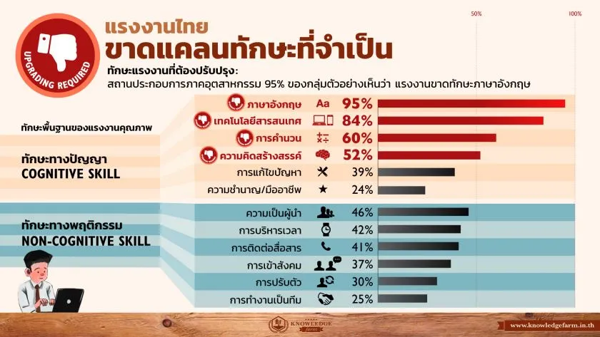 อย่างไรก็ดี จากการตรวจสอบความพร้อมด้านทักษะของแรงงานไทยพบว่า แรงงานไทยส่วนใหญ่มีปัญหาด้านทักษะทางปัญญามากกว่าทักษะทางพฤติกรรม โดยทักษะทางปัญญาที่มีปัญหามากที่สุดของแรงงานไทยคือ ทักษะทางภาษาอังกฤษ ทักษะทางเทคโนโลยีสารสนเทศ ทักษะการคำนวน และทักษะการคิดสร้างสรรค์ ตามลำดับ สำหรับทักษะทางพฤติกรรมหรือทักษะการใช้ชีวิตของแรงงานไทย เช่น ทักษะการเป็นผู้นำ ทักษะการเข้าสังคม หรือทักษะในการแก้ไขปัญหา ทักษะเหล่านี้ก็ถูกระบุว่าเป็นปัญหาเช่นกัน แต่มีความรุนแรงน้อยกว่า
