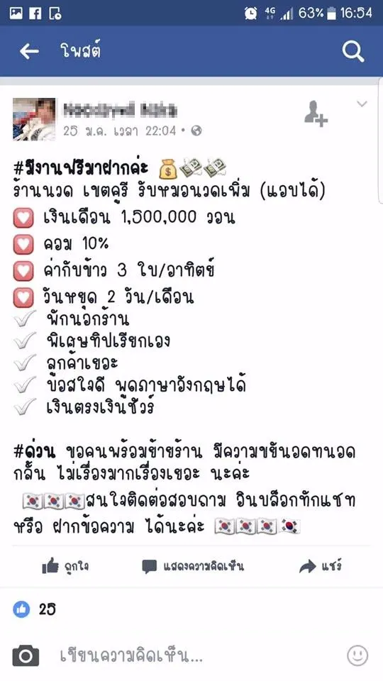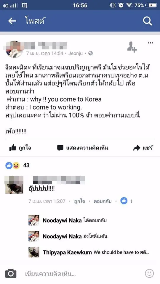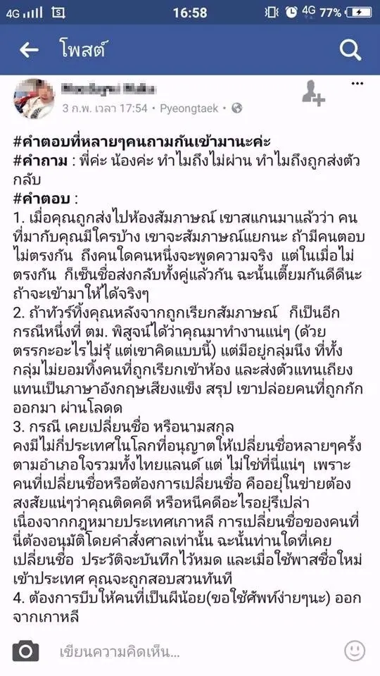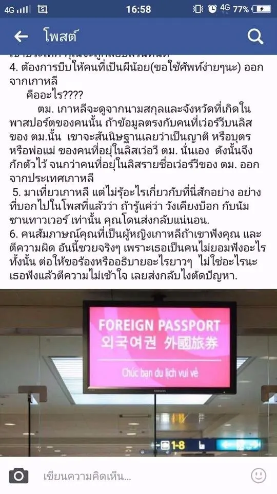 ว่าก่อนหน้านี้ที่มันโพสต์มันหมายความว่าอะไร ทำไมต้องมีการโพสต์เตือนพวกที่ทำงานที่เกาหลีว่าให้ระวังคนมาตรวจสอบถ้าเจตนา...คือพาคนเข้าเมืองเขาแบบถูกหมาย...กลัวอะไร