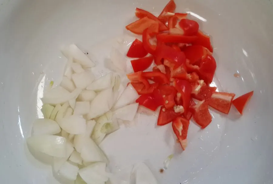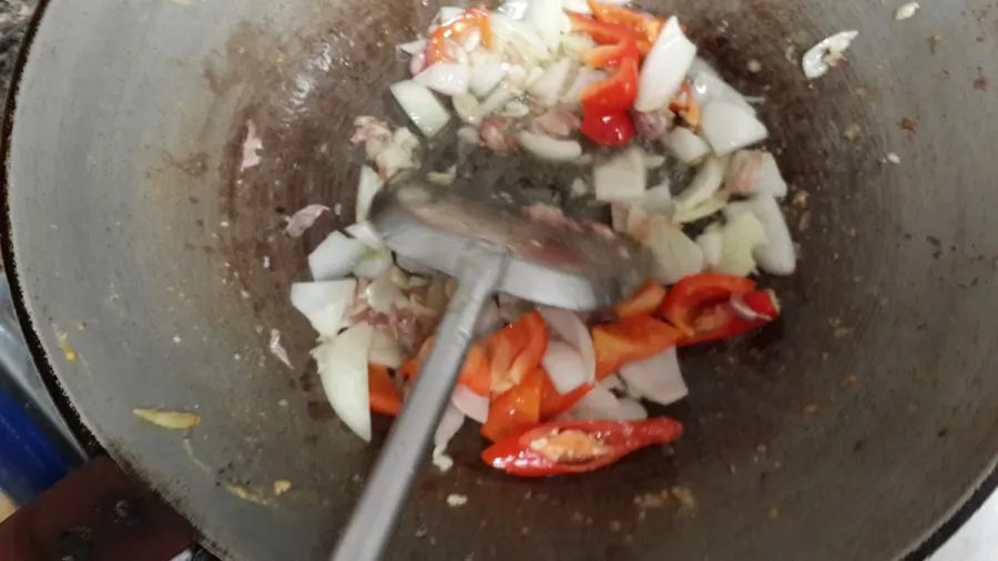หอมใหญ่สับ พริกหวาน พริกชี้ฟ้าแดง ต้นหอม กระเทียม(ใส่ก็ได้ไม่ได้ก็ได้ แล้วแต่อารมณ์)
