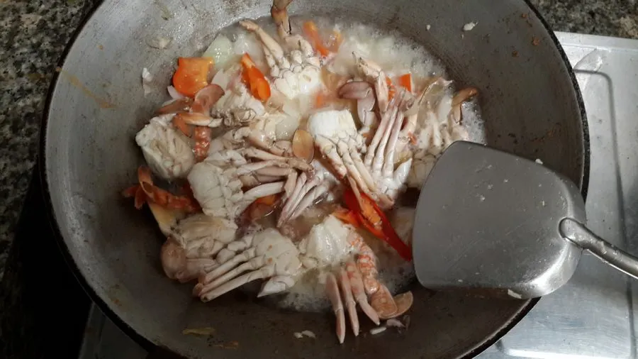 เติมน้ำซุปหรือน้ำเปล่าลงไปหน่อย รอให้เดือด (อันนี้เนื้อปูสุกมาแล้ว ถ้าเป็นปูดิบจะเอาไปทอดก่อนหรือผัดให้สุกก่อนก็ได้)