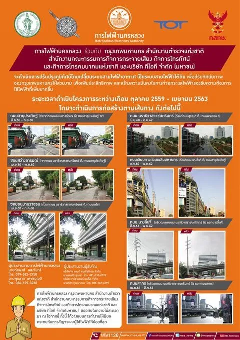 วันที่ 20 พ.ค. การไฟฟ้านครหลวงแจ้งว่า การไฟฟ้านครหลวง(กฟน.) ร่วมกับกรุงเทพมหานคร(กทม.) สำนักงานตำรวจแห่งชาติ สำนักงานคณะกรรมการกิจการกระจายเสียง กิจการโทรทัศน์ และกิจการโทรคมนาคมแห่งชาติ และบริษัท ทีโอที จำกัด (มหาชน) จะดำเนินการปรับปรุงภูมิทัศน์โดยเปลี่ยนระบบสายไฟฟ้าอากาศ เป็นระบบสายไฟฟ้าใต้ดิน เพื่อปรับทัศนียภาพของกรุงเทพฯ ให้สวยงาม เพิ่มประสิทธิภาพ และสร้างความมั่นคงในการจ่ายกระแสไฟฟ้ารองรับความต้องการใช้ไฟฟ้าที่เพิ่มมากขึ้น ระยะเวลาดำเนินโครงการระหว่างเดือน ตุลาคม 2559 - เมษายน 2563 โดยจะดำเนินการก่อสร้างตามเส้นทาง ดังต่อไปนี้
