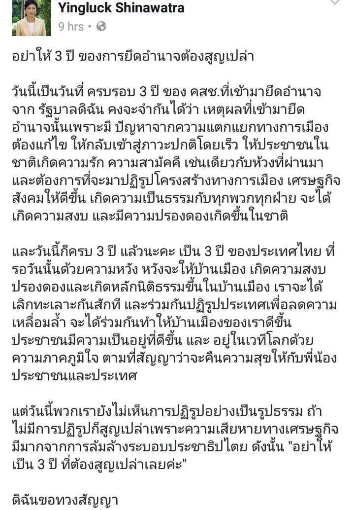 (22 พ.ค.) นางสาวยิ่งลักษณ์ ชินวัตร อดีตนายกรัฐมนตรี โพสต์ข้อความลงเฟสบุ๊ก ถึงเหตุการณ์ครบรอบ 3 ปี ที่ถูกคณะรักษาความสงบแห่งชาติ หรือ คสช. ยึดอำนาจ โดยระบุว่า อย่าให้ 3 ปี ของการยึดอำนาจต้องสูญเปล่า...ดิฉันขอทวงสัญญา