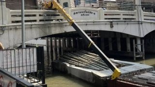 ระทึกกลางกรุง! รถ 6 ล้อบรรทุกเครนพลิกคว่ำหวิดตกคลอง น้ำมันรั่วเกลื่อนถนน บาดเจ็บ 2 ราย