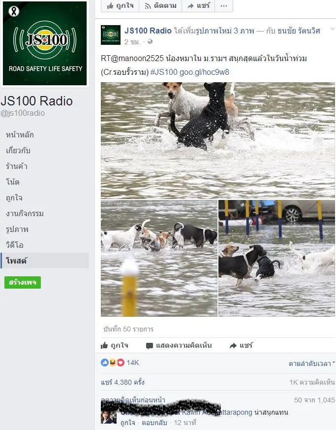 เมื่อวันนี้ 25/5/2560 มีน้ำท่วมขัง สูง หลายพื้นที่ จากฝนตกหนัก ในคืนที่ผ่านมา แต่ทั้งนี้ ทางเฟซบุ้ค JS 100 Radio ก็ได้แชร์ภาพของน้องหมาที่กำลังมีความสุข กับการเล่นน้ำ ทำเอาชาวเน็ตกดไลค์กดแชรืกันมากมาย ตามรูปข้างล่าง