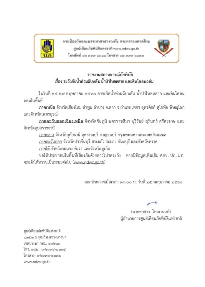 วันที่ 25 พ.ค. ศูนย์เตือนภัยพิบัติแห่งชาติ(ศภช.) แจ้งว่า ในวันที่ 25-27 พ.ค.2560 อาจเกิดน้ำท่วมฉับพลัน น้ำป่าไหลหลาก และดินโคลนถล่ม ในพื้นที่ จ.เชียงใหม่ ลำพูน ลำปาง อุตรดิตถ์ ตาก กำแพงเพชร สุโขทัย เพชรบูรณ์ ชัยภูมิ นครราชสีมา บุรีรัมย์ สุรินทร์ ศรีสะเกษ อุบลราชธานี อุทัยธานี สุพรรณบุรี กาญจนบุรี กรุงเทพมหานครและปริมณฑล ปราจีนบุรี สระแก้ว ระยอง จันทบุรี ตราด ระนอง พังงา และ จ.ภูเก็ต ขอให้ประชาชนในพื้นที่เสี่ยงภัยดังกล่าวโปรดระวัง หากมีข้อมูลเพิ่มเติม ศภช. ปภ. มท. จะแจ้งให้ทราบเป็นระยะต่อไป