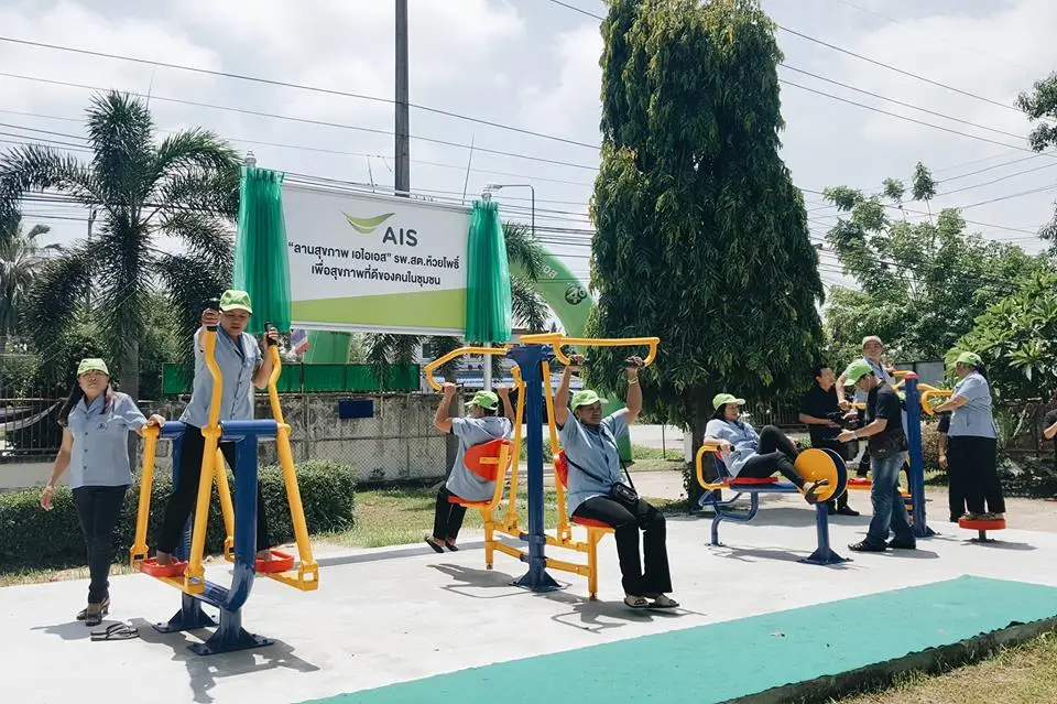 “โดยหนึ่งในโครงการดูแลสังคมและอยู่ร่วมกับชุมชนอย่างยั่งยืนนั้นคือ โครงการ “ลานสุขภาพเอไอเอส เพื่อสุขภาพที่ดีของคนในชุมชน” ซึ่งจะจัดสร้างไว้ ณ โรงพยาบาลส่งเสริมสุขภาพตำบล (รพ.สต.) ด้วยเล็งเห็นว่า ปัจจุบัน การเพิ่มขึ้นของความเจ็บป่วยจากการเป็นโรคไม่ติดต่อเรื้อรังของประชาชนทั่วทั้งประเทศมีอัตราสูงขึ้น โดยสาเหตุหลักมาจากอาหาร การขาดการออกกำลังกาย และความเครียด ถึงแม้จะมีการส่งเสริมและให้ความรู้เชิงป้องกัน โดยหน่วยพยาบาลระดับปฐมภูมิของชุมชนหรือรพ.สต.แล้วก็ตาม แต่การขาดการออกกำลังกายอย่างต่อเนื่องและสม่ำเสมอ ก็ยังส่งผลให้ป่วยเป็นโรคไม่ติดต่อเรื้อรัง เอไอเอส จึงได้ร่วมมือกับรพ.สต.ในแต่ละพื้นที่จัดสร้างลานสุขภาพพร้อมเครื่องออกกำลังกายและลานเดินนวดเท้าไว้ ณ รพ.สต.เพื่อให้เจ้าหน้าที่ที่ดูแลงานสาธารณสุขชุมชนและเครือข่ายอสม.ใช้เป็นศูนย์กลางในการดูแลส่งเสริมสุขภาพของคนในชุมชน ให้เห็นความสำคัญของการออกกำลังกาย และมีการออกกำลังกายอย่างต่อเนื่องและสม่ำเสมอ ตลอดจนสามารถติดตามและประเมินผลด้านสุขภาพได้อย่างใกล้ชิด เพื่อมุ่งให้คนในชุมชนมีสุขภาพที่ดี แข็งแรง ห่างไกลโรค อันจะทำให้มีคุณภาพชีวิตที่ดี และชุมชนมีความเข้มแข็งอย่างยั่งยืน”