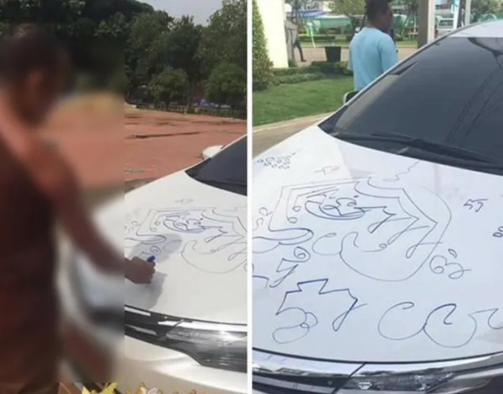 ดูสิ ยันต์ใหญ่ซะด้วย ลงซะเต็มหน้ารถเลยเจ้าของรถเห็นแล้วคงอยากร้องไห้ !