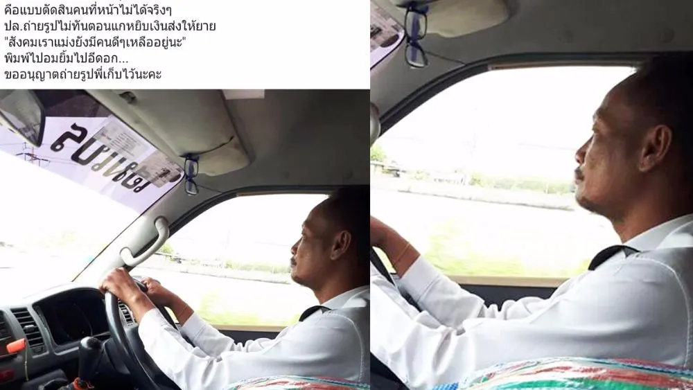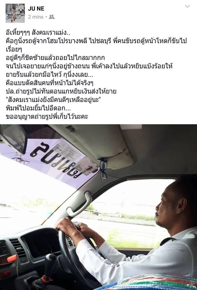 โพสท์จาก เฟซบุ๊คที่ชื่อว่า JU NE โพสท์เรื่องราวที่น่าประทับใจ เรื่องมีอยู่ว่าเจ้าของโพสท์นั่งรถตู้จาพบางพลีไปชลบุรี เห็นพี่คนขับดูหน้าโหดๆ อยู่ๆขณะที่ขับรถอยู่นั้นพี่คนขับชิดซ้ายแล้วถอยรถไปไกลพอสมควร หลังจากนั้นก็จอดแล้วหยิบแบงค์ร้อยให้คุณยายแก่ๆคนหนึ่งที่ข้างถนน...เป็นเรื่องราวดีๆที่ได้อ่านแล้วมีความสุขไปด้วย โดย JU NE โพสท์ว่า..