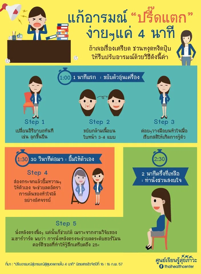 ศูนย์เรียนรู้สุขภาวะ ได้จัดทำอินโฟกราฟฟิกแนะนำ 5 ขั้นตอนการ “ปรับอารมณ์ปรี๊ดแตก ให้อารมณ์ดีขึ้นได้ในเวลาแค่ 4 นาที” ซึ่งเป็นข้อมูลจาก Daniela Tempesta นักจิตบำบัดชื่อดังจากสหรัฐอเมริกา เพื่อนๆลองเอาไปใช้กันดูนะครับ