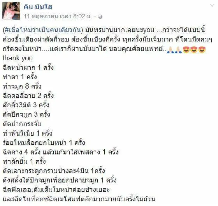 โดยระบุข้อความดังนี้ “(#เชื่อไหมว่าเป็นคนเดียวกัน) มันทรมานมากเลยนะyou …กว่าจะได้แบบนี้ ต้องขึ้นเตียงผ่าตัดกี่รอบ ต้องขึ้นเขียงกี่ครั้ง ทุกครั้งมันเจ็บมาก ที่โดนมีดคมๆกรีดลงใบหน้า….เเต่เราก็ผ่านมันมาได้ ขอบคุณศัลยแพทย์..😍😍😍 thank you ฉีดหน้าผาก 1 ครั้ง ทำตา 1 ครั้ง ทำจมูก 8 ครั้ง ฉีดดอลี่อาย 2 ครั้ง สักคิ้ว3มิติ 3 ครั้ง ตัดปีกจมูก 3 ครั้ง ตัดปากกระจับ ทำฟันวีเนีย 1 ครั้ง ร้อยไหมล็อกยกใบหน้า 1 ครั้ง ฉีดคาง 4 ครั้ง แล้วแก้มาใส่เพสคาง 1 ครั้ง ทำลักยิ้ม 1 ครั้ง ตัดเลาะกระดูกกรามข้างละ4มิน 1ครั้ง ดึงสลิ้งใต้ปีกจมูกเพื่อยกปลายจมูก 1 ครั้ง ฉีดฟิลเลอเติมเต็มใบหน้าค่อยข้างเยอะ และฉีดโบท็อกซ์ฉีดเมโสแฟตอีกมากมายนับครั้งไม่ถ้วน”