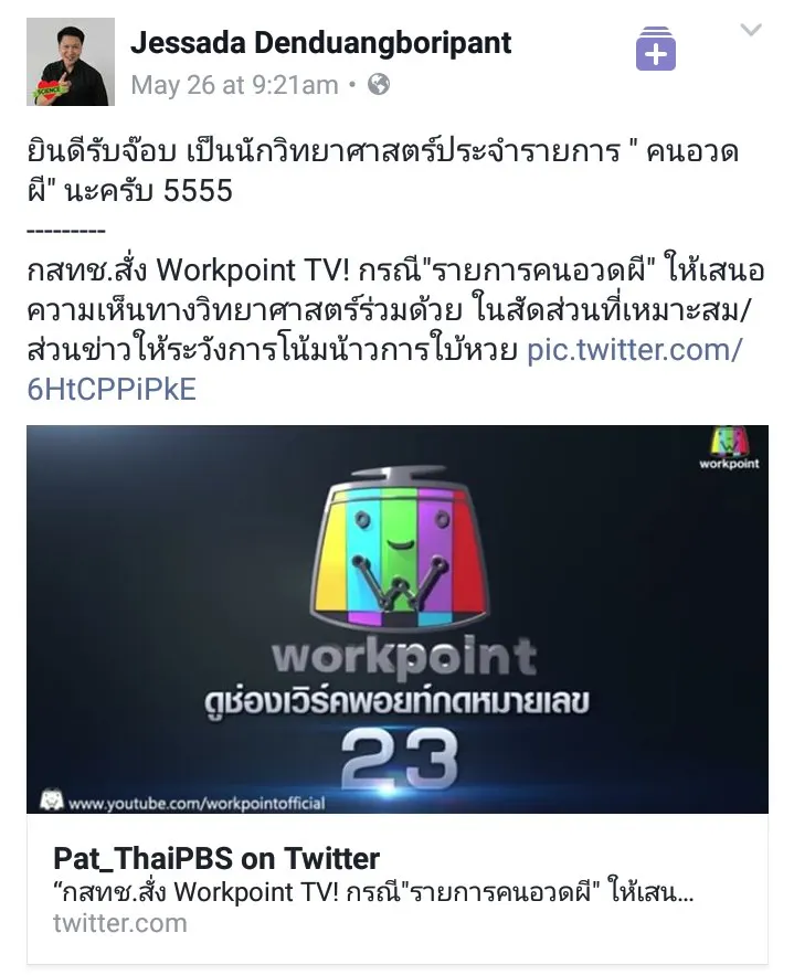 กสทช.สั่ง Workpoint TV! กรณี"รายการคนอวดผี" ให้เสนอความเห็นทางวิทยาศาสตร์ร่วมด้วย ในสัดส่วนที่เหมาะสม/ ส่วนข่าวให้ระวังการโน้มน้าวการใบ้หวย pic.twitter.com/6HtCPPiPkE