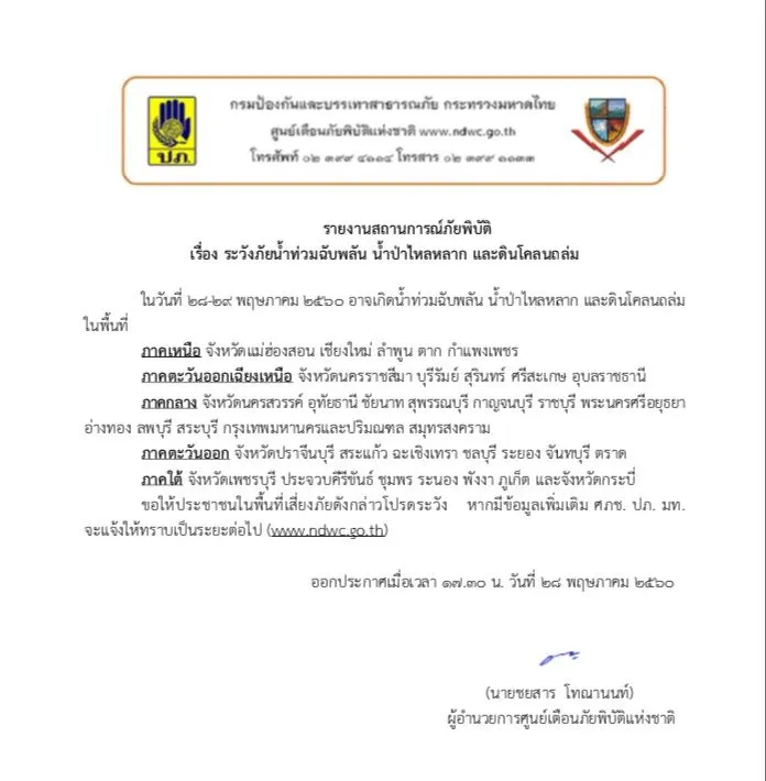 วันที่ 28 พ.ค. เวลา 17.15 น. ศูนย์เตือนภัยพิบัติแห่งชาติ(ศภช.) แจ้งว่า ในวันที่ 28-29 พ.ค.2560 อาจเกิดน้ำท่วมฉับพลัน น้ำป่าไหลหลาก และดินโคลนถล่ม ในพื้นที่ จ.แม่ฮ่องสอน เชียงใหม่ ลำพูน ตาก กำแพงเพชร นครราชสีมา บุรีรัมย์ สุรินทร์ ศรีสะเกษ อุบลราชธานี นครสวรรค์ อุทัยธานี ชัยนาท สุพรรณบุรี กาญจนบุรี ราชบุรี พระนครศรีอยุธยา อ่างทอง ลพบุรี สระบุรี กทม.และปริมณฑล สมุทรสงคราม ปราจีนบุรี สระแก้ว ฉะเชิงเทรา ชลบุรี ระยอง จันทบุรี ตราด เพชรบุรี ประจวบคีรีขันธ์ ชุมพร ระนอง พังงา ภูเก็ต และ จ.กระบี่ ขอให้ประชาชนในพื้นที่เสี่ยงภัยดังกล่าวโปรดระวัง หากมีข้อมูลเพิ่มเติม ศภช. ปภ. มท. จะแจ้งให้ทราบเป็นระยะต่อไป.