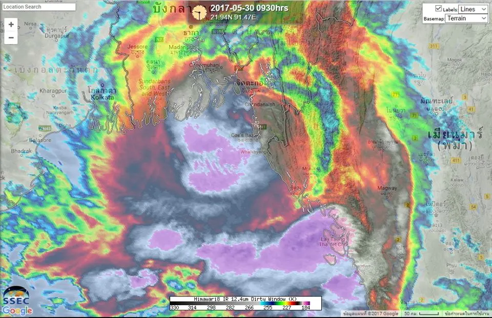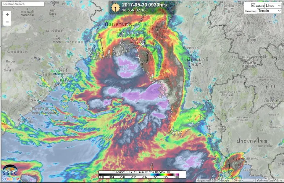 | ลักษณะสำคัญทางอุตุนิยมวิทยา | พายุไซโคลน “โมรา” (MORA) บริเวณชายฝั่งประเทศเมียนมา และมีแนวโน้มเคลื่อนขึ้นฝั่งบริเวณประเทศบังคลาเทศและเมียนมาในวันนี้ (30พ.ค.) ประกอบกับมรสุมตะวันตกเฉียงใต้ที่พัดปกคลุมทะเลอันดามันและประเทศไทยมีกำลังแรง ลักษณะเช่นนี้ทำให้ประเทศไทยยังคงมีฝนตกชุกหนาแน่นและมีฝนตกหนักถึงหนักมากบางพื้นที่ในภาคเหนือ ภาคตะวันออกเฉียงเหนือ ภาคกลาง และภาคตะวันออก ส่วนคลื่นลมบริเวณทะเลอันดามันและอ่าวไทยตอนบนยังคงมีกำลังแรง |