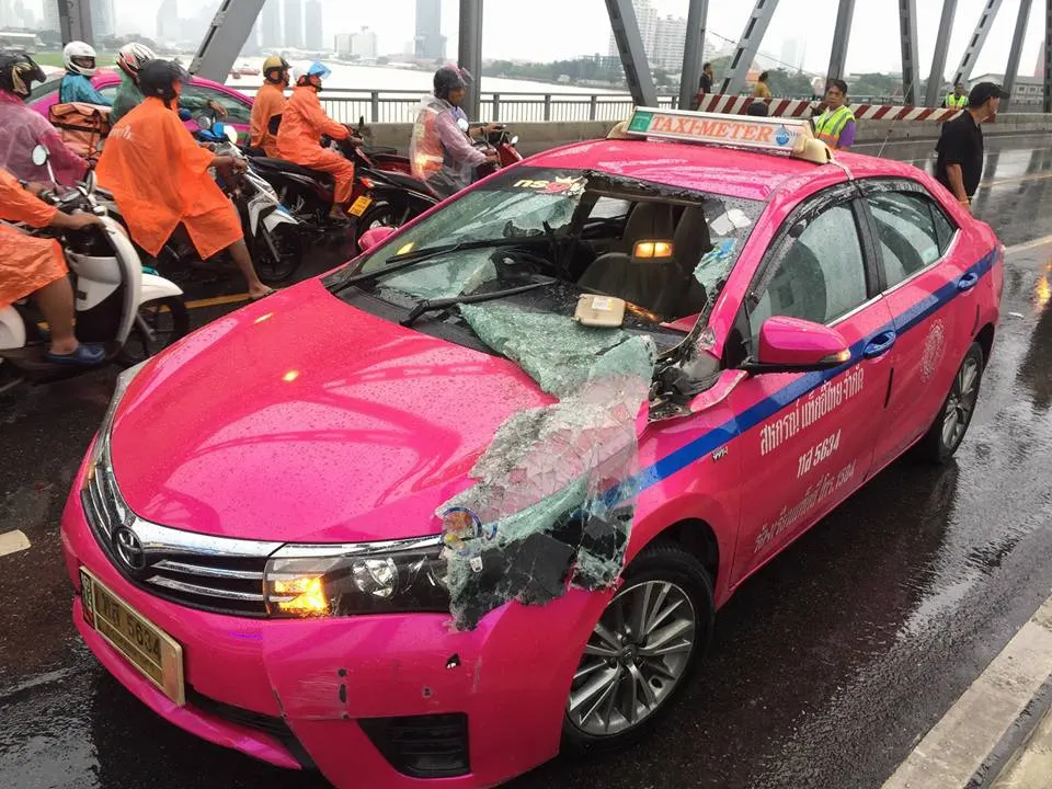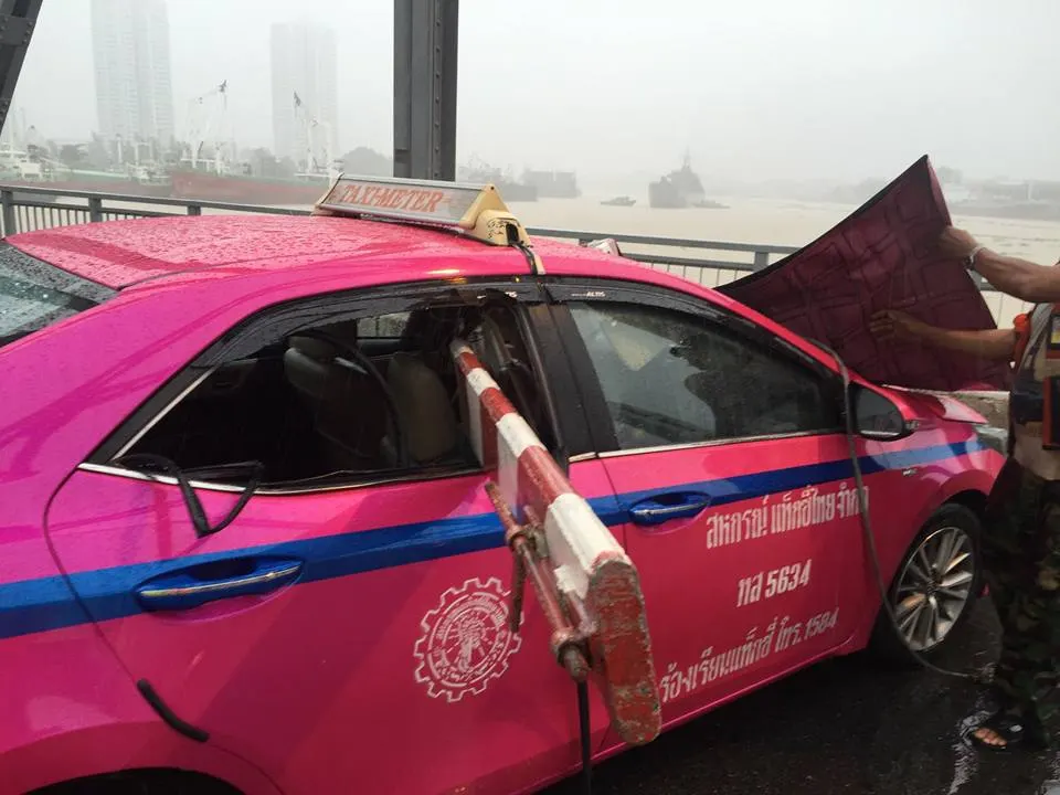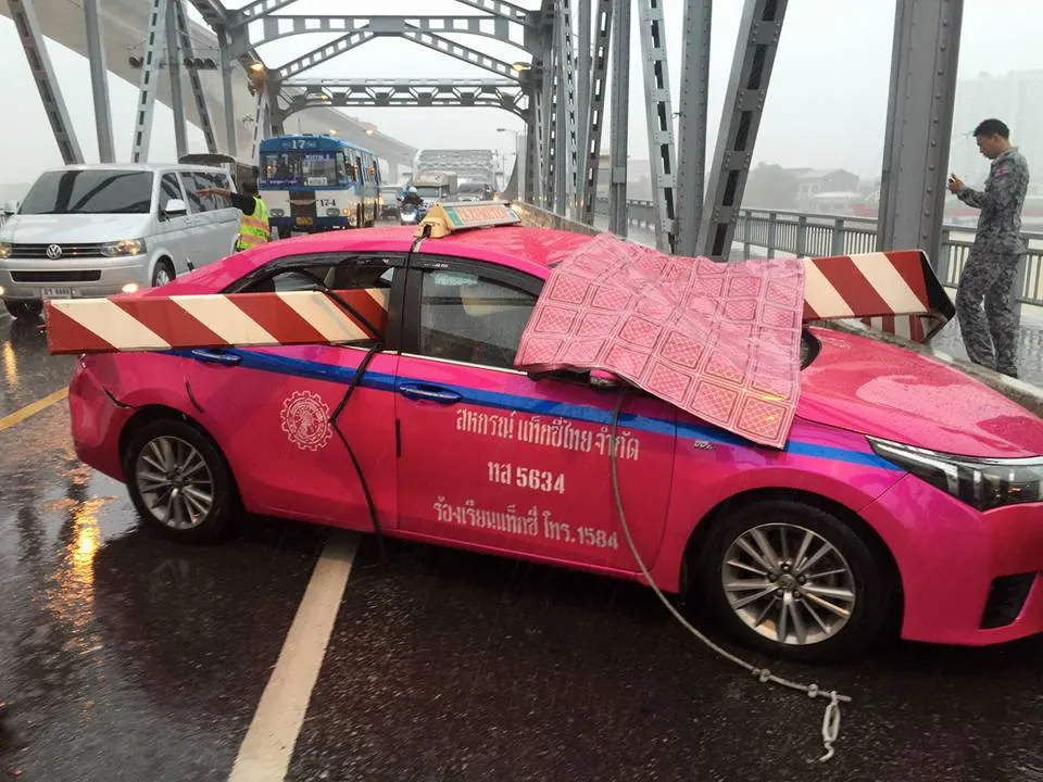 เหล็กกั้นการจราจรบนสะพานกรุงเทพ ถูกลมกระโชกแรงสะบัดตีใส่รถแท็กซี่ คนขับบาดเจ็บ