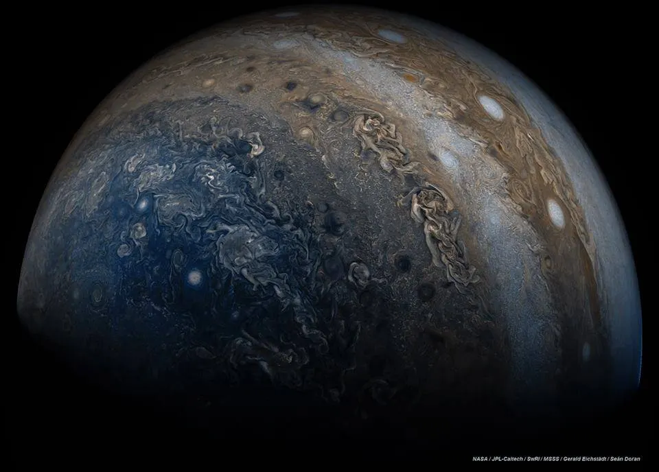ยานสำรวจอวกาศจูโนเผยภาพใหม่ของพายุบนดาวพฤหัสบดี โดยเป็นภาพบริเวณขั้วโลกของดาวพฤหัสบดี เผยให้เห็นกลุ่มเมฆ และพายุที่แปรปรวนบริเวณขั้วโลกของดาวพฤหัสบดี