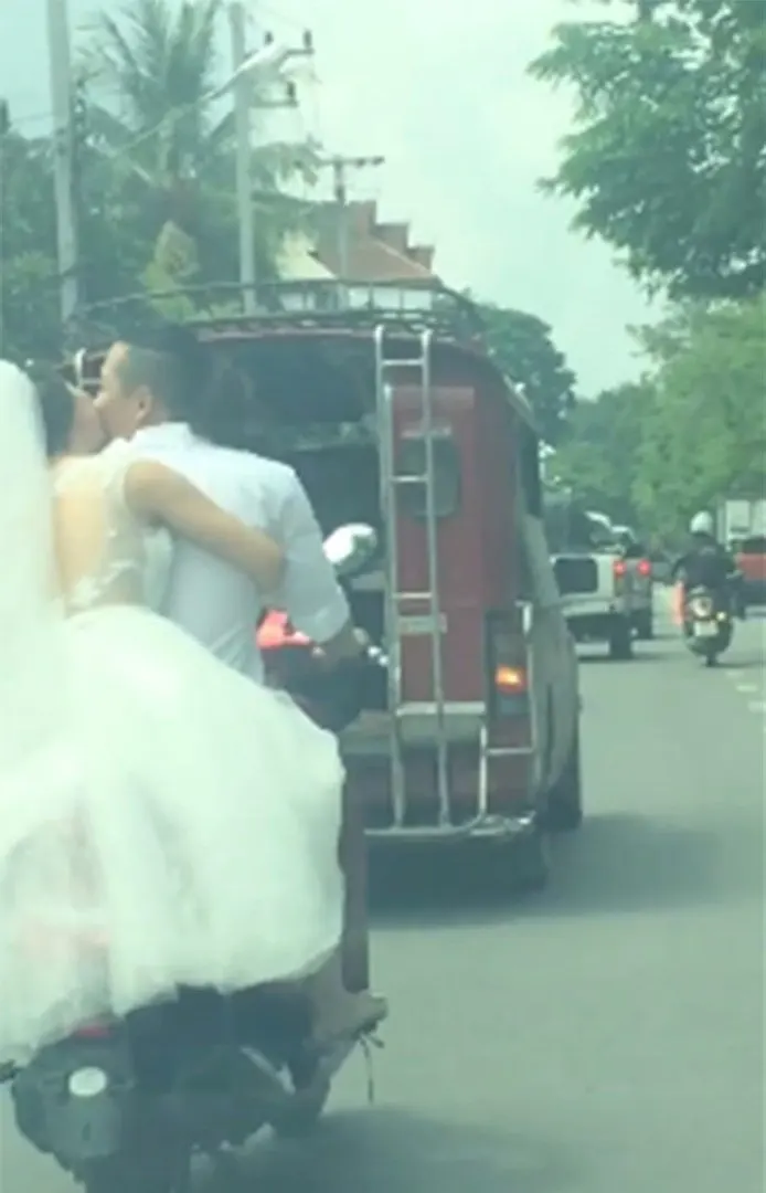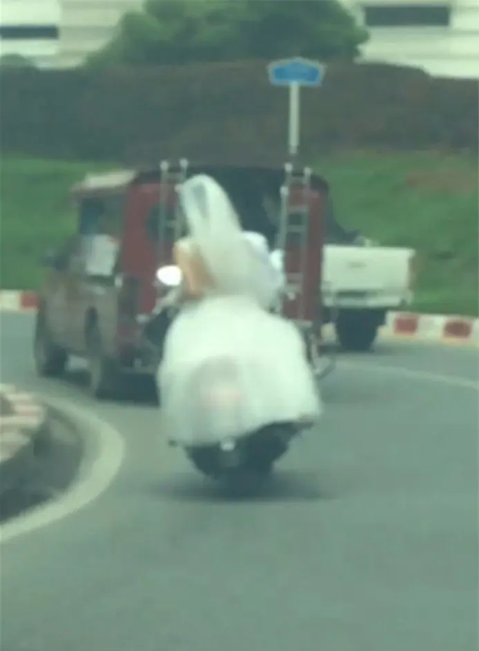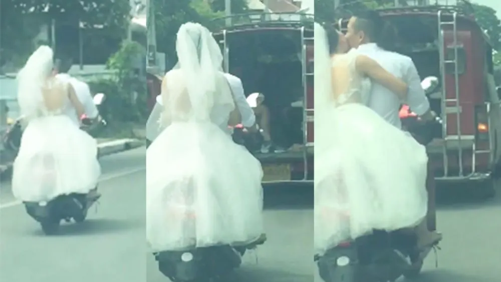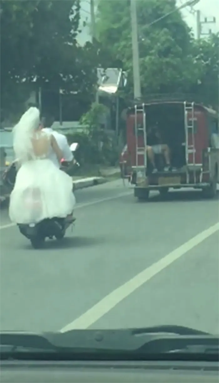 ผู้ใช้เฟซบุ๊กชื่อ เกอร์ สมบูรณ์วงศ์ ได้โพสต์คลิป คู่บ่าวสาวแว้นมอเตอร์ไซค์ในตัวเมืองเชียงใหม่ โดยเกอร์ สมบูรณ์วงศ์ ระบุในคลิปว่า “ถ่ายไปฮาไป ขอแสดงความยินดีกับคู่บ่าวสาวด้วยครับ 555” คู่รักทั้งสองคนก็มีการแสดงความรักต่อกันขณะขับขี่มอเตอร์ไซค์ โดยมีรถสองแถวแดงที่มีช่างภาพ ขับนำหน้าเพื่อถ่ายภาพบันทึกภาพ คาดว่าทั้งคู่น่าจะเป็นนักท่องเที่ยวชาวจีน และในระหว่างนั้นเจอตำรวจตั้งด่านเรียกตรวจ เพราะทั้งคู่ไม่สวมหมวกกันน็อค โดนปรับไป 200บาท