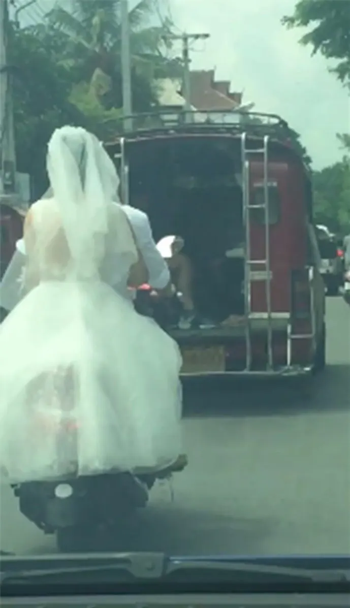 บ่าวสาวชาวจีนสวมชุดแต่งงานแว้นมอเตอร์ไซค์สวีทวี่วี กลางเมืองเชียงใหม่ แต่โดนตำรวจโบกซะก่อน เพราะไม่สวมหมวกกันน็อค