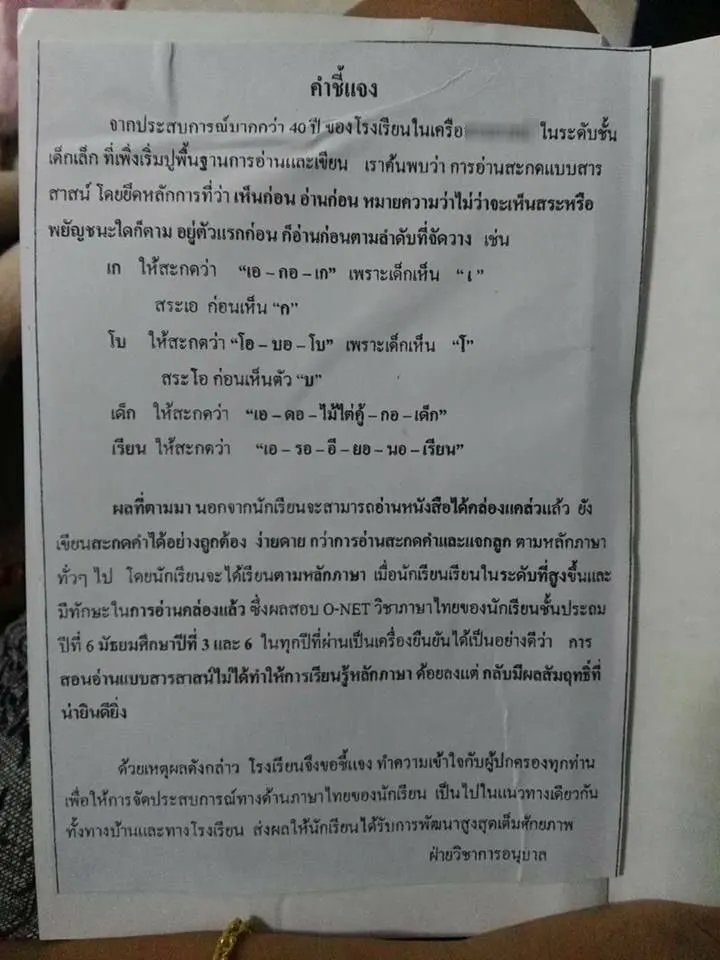 หลังจากที่ทางเพจ มานะ มานี ปิติ ชูใจ ได้ตีแผ่เรื่องการสะกดคำไม่ ตรงตามหลักภาษาของโรงเรียนแ ห่งหนึ่งอย่างต่อเนื่อง เมื่อช่วงวันเปิดเทอมใหม่ที ่ผ่านมา ทางโรงเรียนดังกล่าวได้มีคำ ชี้แจงเกี่ยวกับเรื่องการสะ กดคำในแบบของตน ผ่านผู้ปกครองเป็นลายลักษณ์ อักษรดังภาพนี้