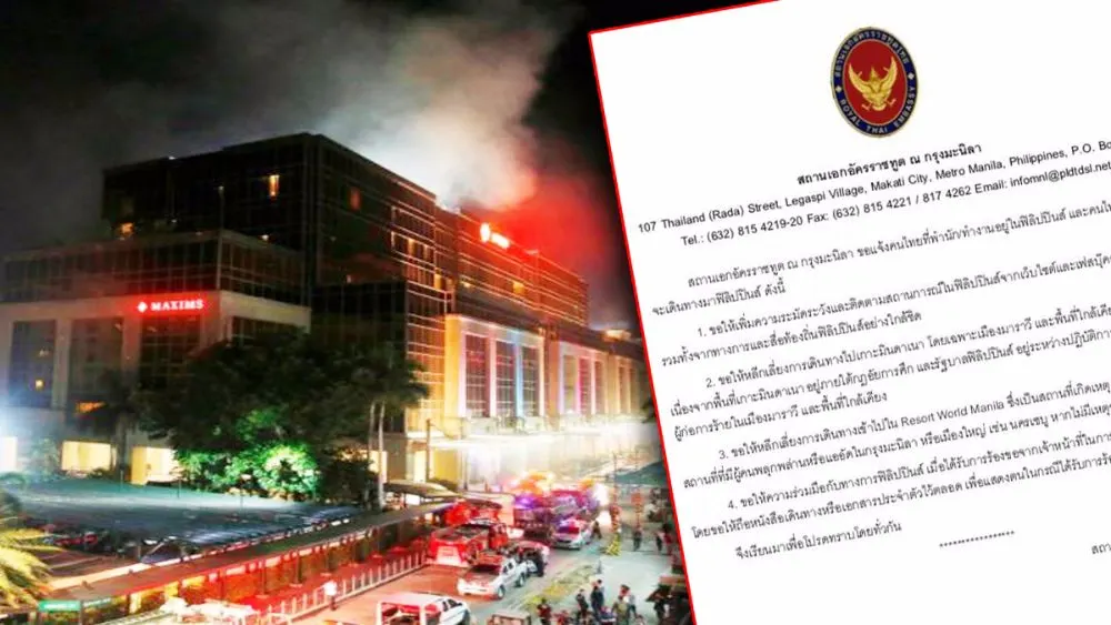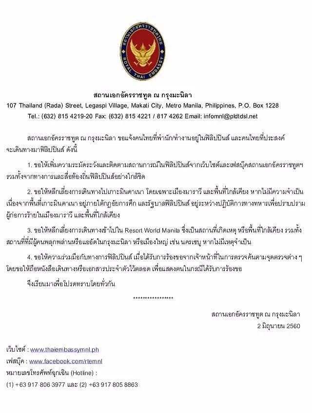 เช้าวันนี้ หลังเกิดเหตุอุกอาจ คนร้ายถือปืนยาวบุก Resort World Manila จุดไฟเผาตัวเองตาย และทำให้มีผู้เสียชีวิตกว่า 30 ราย (สำลักควัน ) ซึ่งเป็นสถานบันเทิง มีคาสิโน ห้างร้านหรู และโรงแรมอยู่ภายใน และอยู่ตรงข้ามสนามบินนานาชาติ ทางสถานทูตไทย ณ กรุงมะนิลา ( Royal Thai Embassy, Manila สถานเอกอัครราชทูตไทย ณ กรุงมะนิลา) ได้ออกหนังสือเตือน คนไทยในฟิลิปปินส์ หรือคนที่กำลังจะเดินทางไปยังฟิลิปปินส์ ให้หลีกเลี่ยงการเดินทางไปยัง มินดาเนา โดยเฉพาะเมืองมาราวี และ Resort World Manila หลังเกิดเหตุความไม่สงบ โดยมีข้อความดังนี้