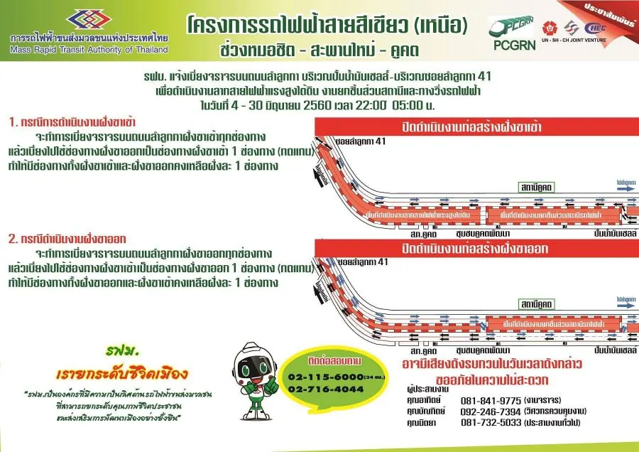 การรถไฟฟ้าขนส่งมวลชนแห่งประเทศไทย (รฟม.) แจ้งว่า กิจการร่วมค้ายูเอ็น-เอสเอช-ซีเอช ผู้รับจ้างก่อสร้างงานโยธา โครงการรถไฟฟ้าสายสีเขียว (เหนือ) ช่วงหมอชิต – สะพานใหม่ – คูคต สัญญาที่ 2 จะดำเนินงานลากสายไฟฟ้าแรงสูงใต้ดิน งานยกชิ้นส่วนสถานีและทางวิ่งรถไฟฟ้า บริเวณปั๊มน้ำมันเชลล์ ถึงบริเวณซอยลำลูกกา 41 จึงมีความจำเป็นต้องเบี่ยงช่องทางจราจรบนถนนลำลูกกา ในวันที่ 4 มิ.ย. - 30 มิ.ย.2560 ระหว่างเวลา 22.00 - 05.00 น. โดยจะเบี่ยงช่องทางจราจรตามการดำเนินงานลากสายไฟฟ้าแรงสูงใต้ดิน งานยกชิ้นส่วนสถานีและทางวิ่งรถไฟฟ้า ซึ่งดำเนินงานทั้งฝั่งขาออกและฝั่งขาเข้า มีรายละเอียดการเบี่ยงช่องทางจราจรเป็น 2 กรณี ดังนี้